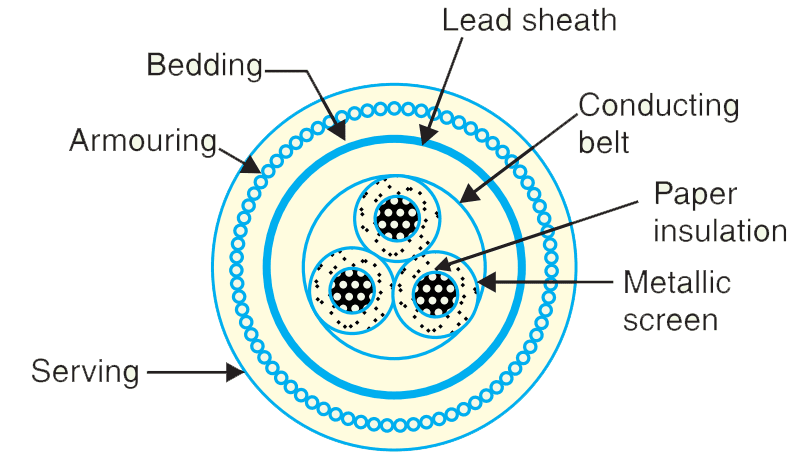 The belt is covered with lead sheath to protect the cable against ingress of moisture and mechanical injury. The lead sheath is covered with one or more layers of armoring with an outer serving (not shown in the figure).